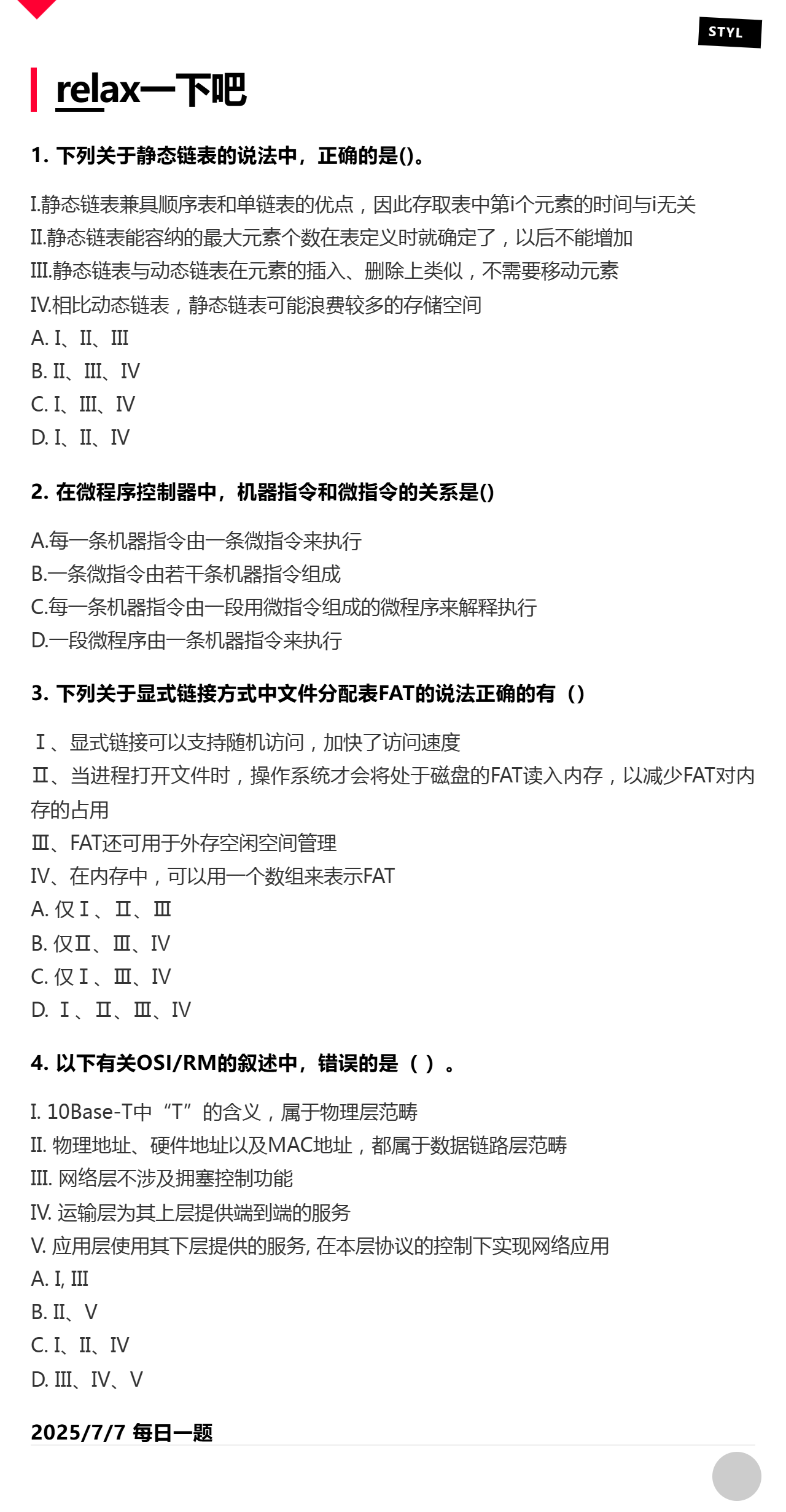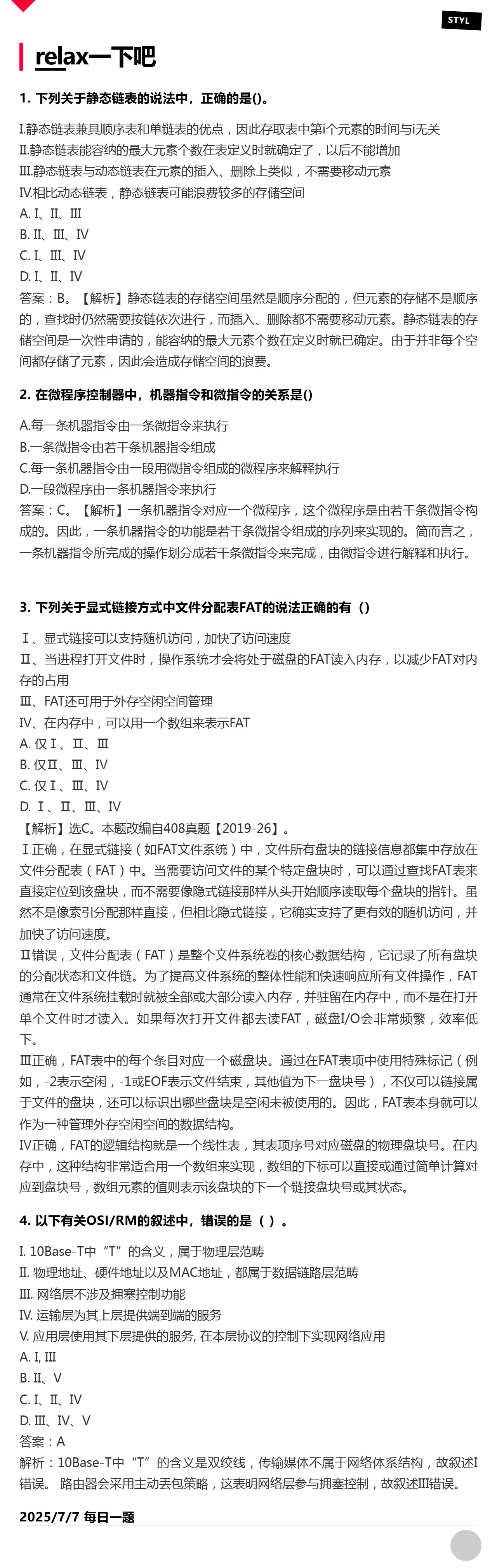 7.7 静态链表、微程序控制器、文件管理、OSI模型