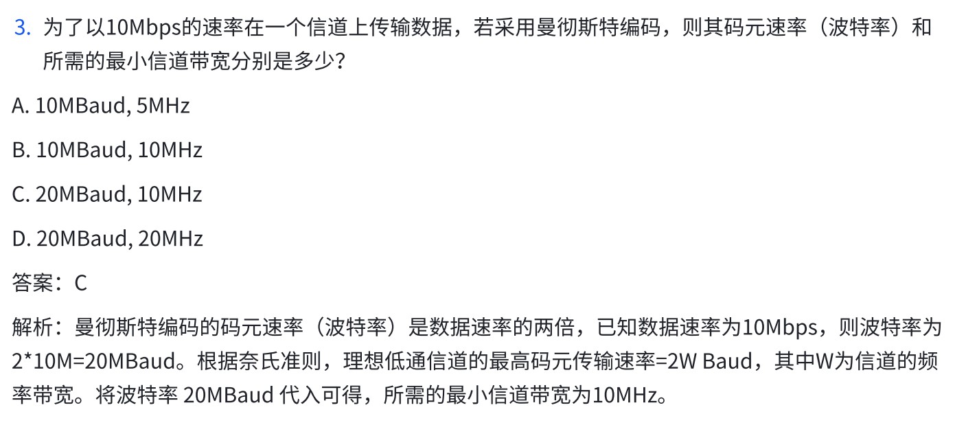- 曼切斯特编码有两种码元0和1,需要1个二进制位来表示,因此曼切斯特编码的码元速率(波特率)是数据速率的两倍
