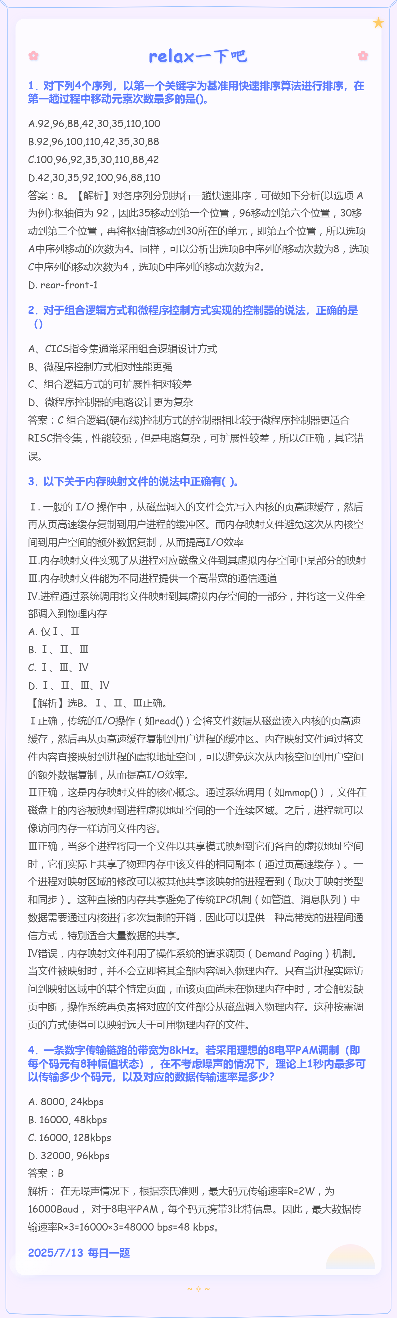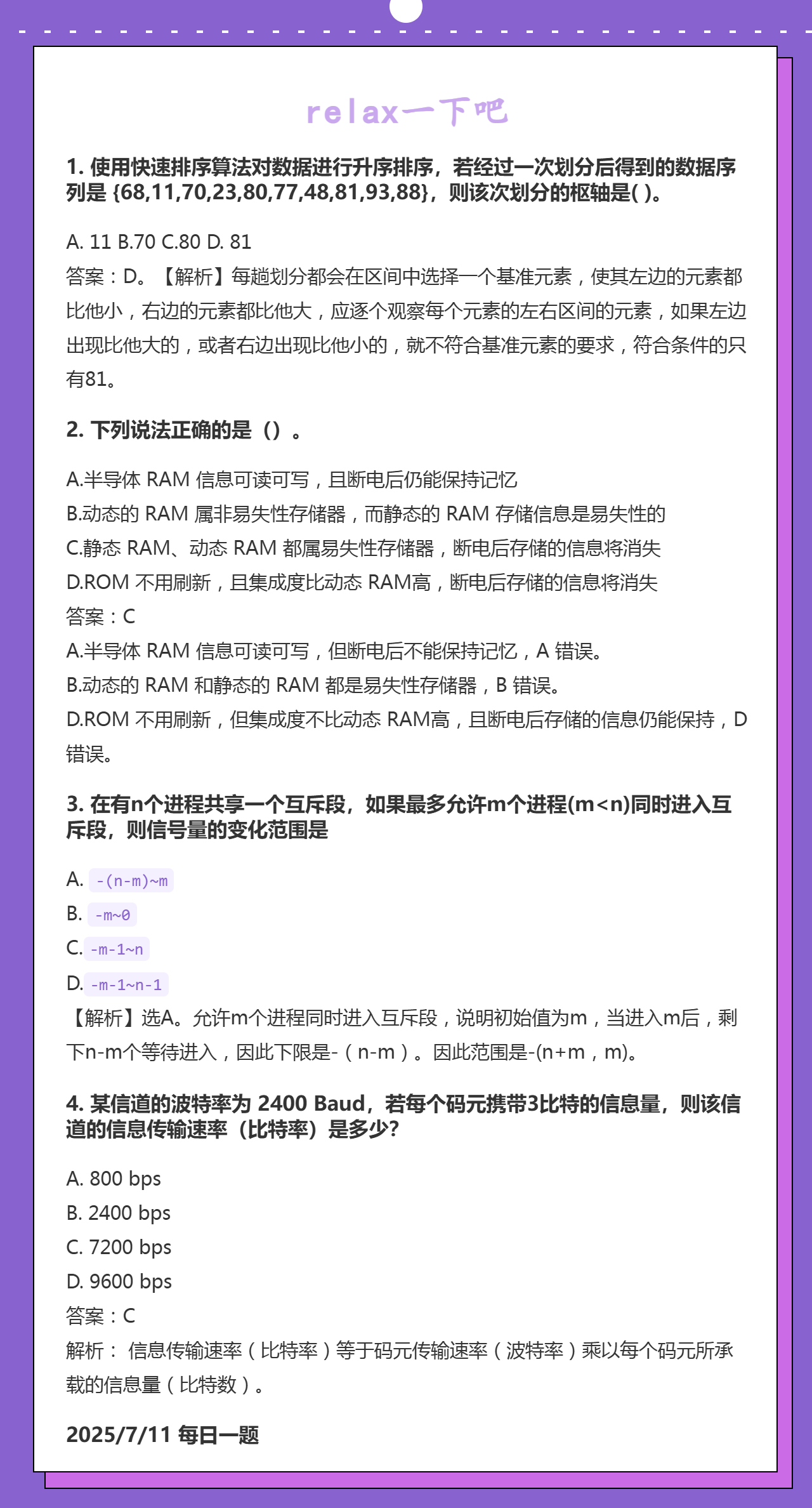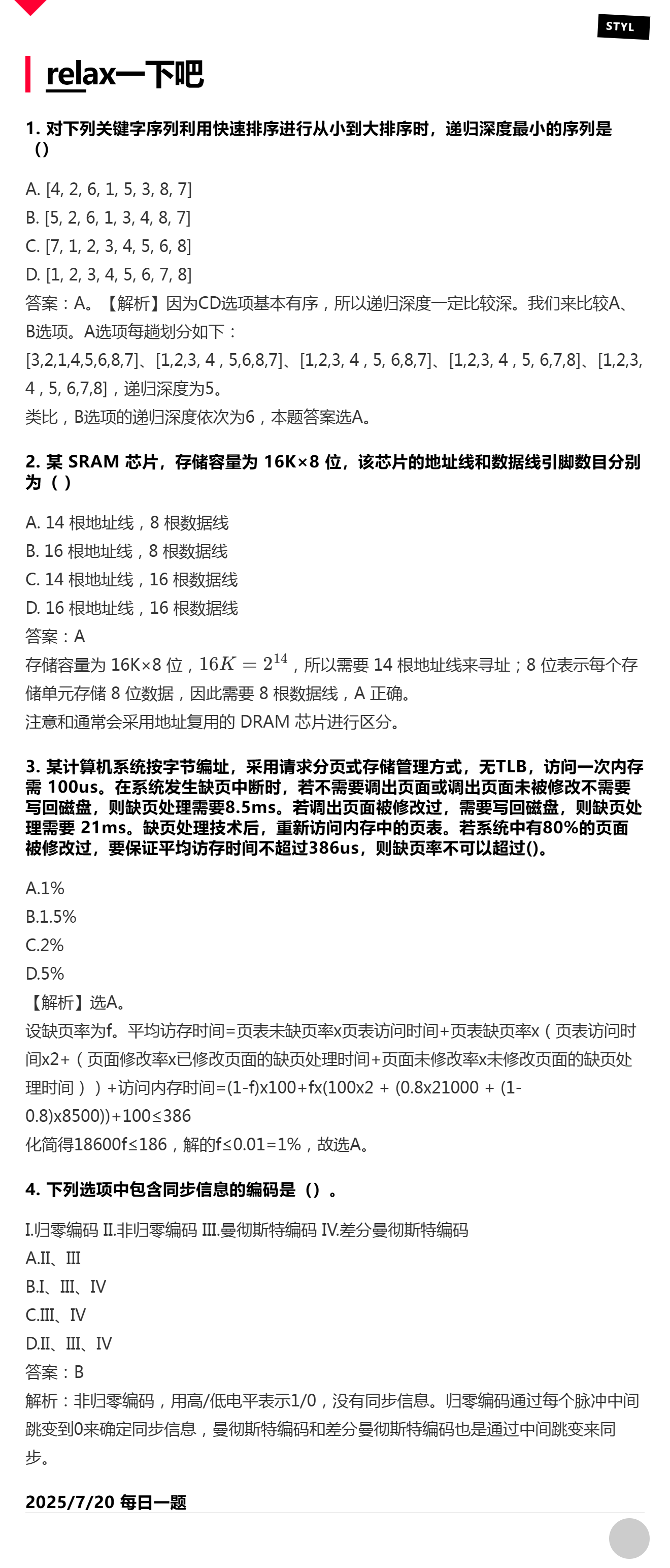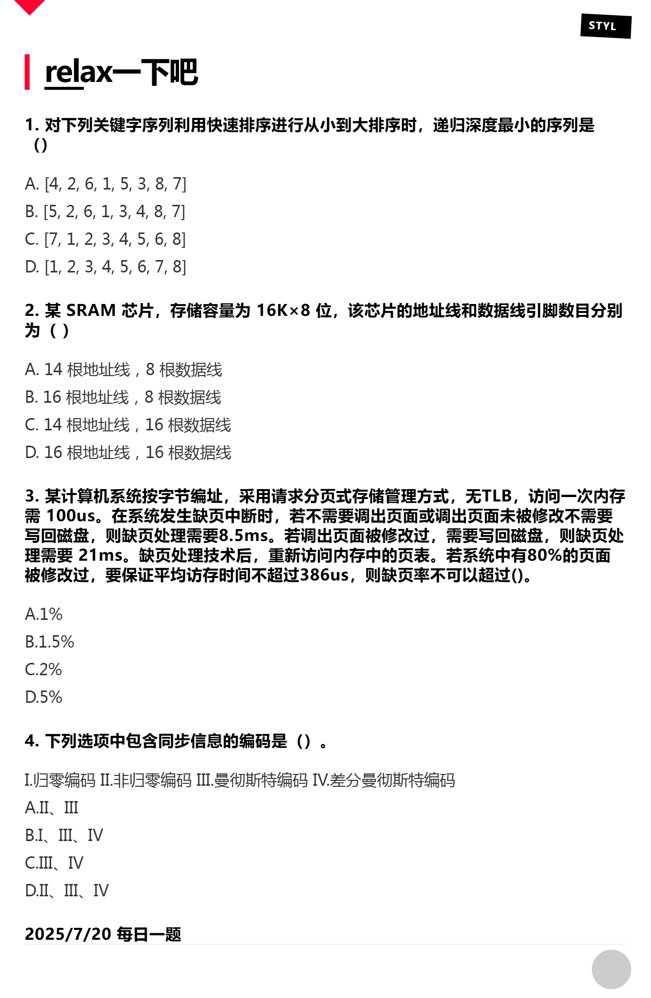 7.20 快速排序和SRAM和分页存储管理方式和通信基础