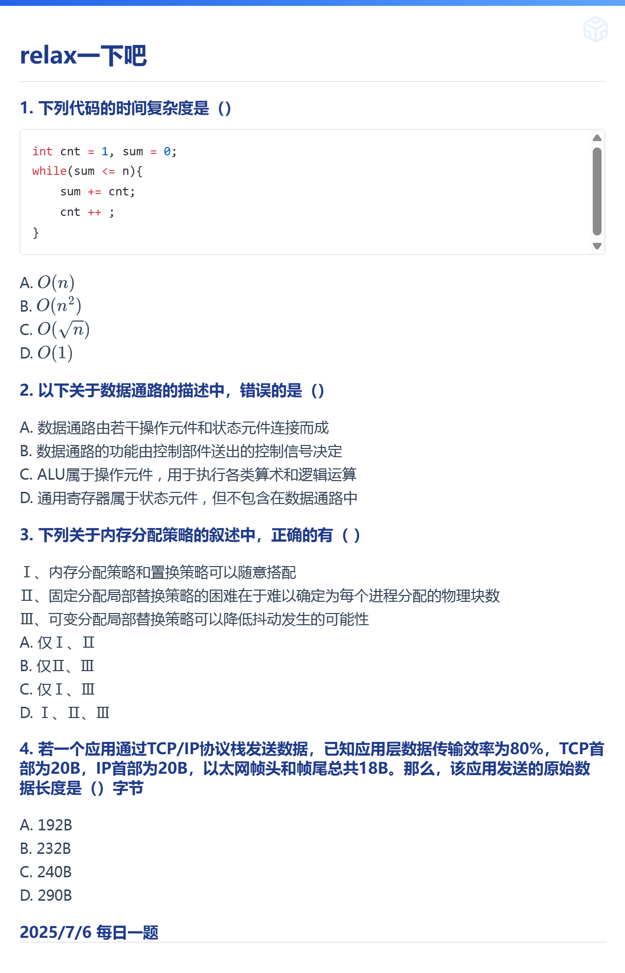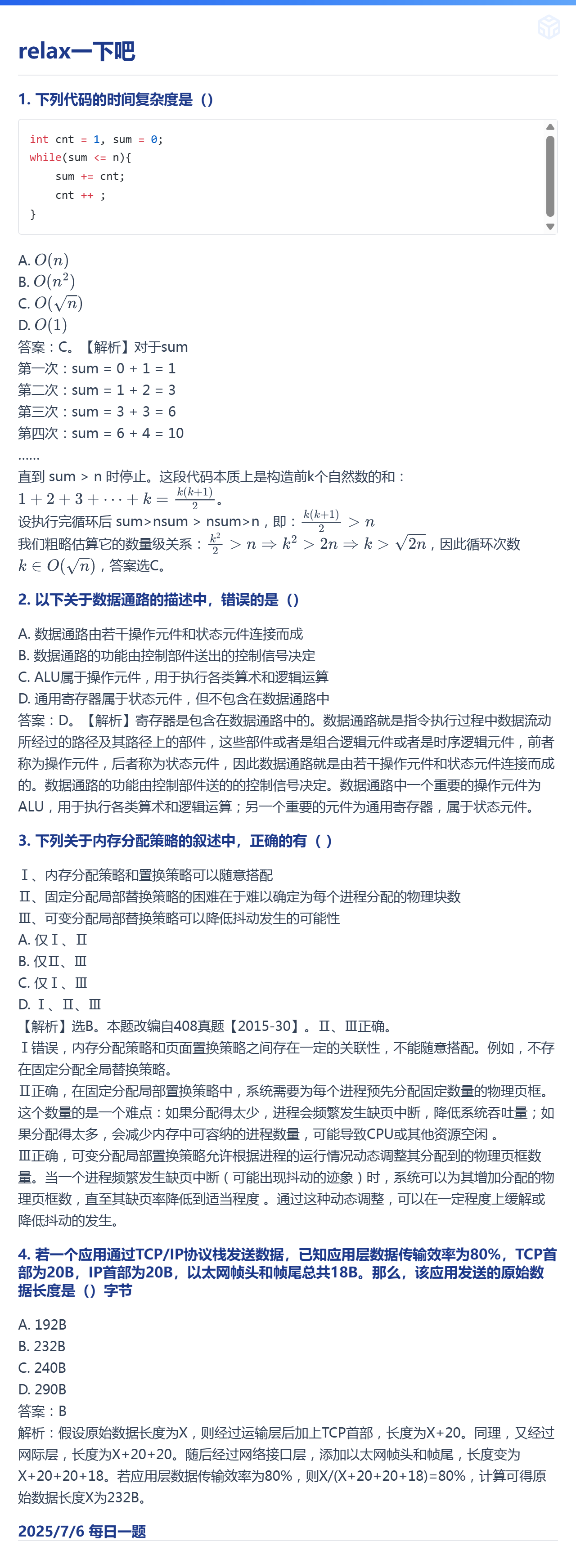 7.6 时间复杂度、CPU的基本结构、内存管理、TCP/IP