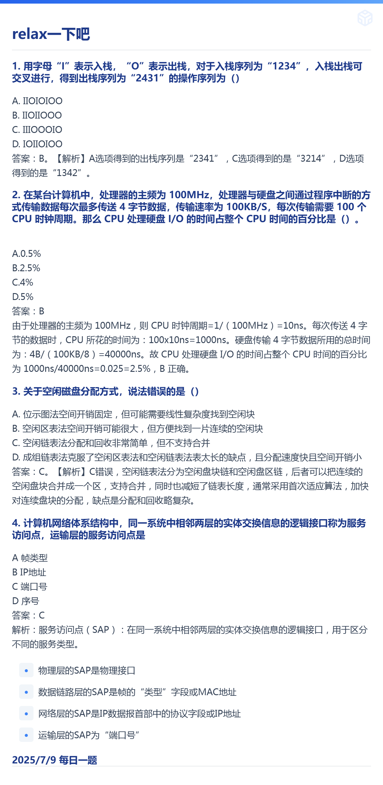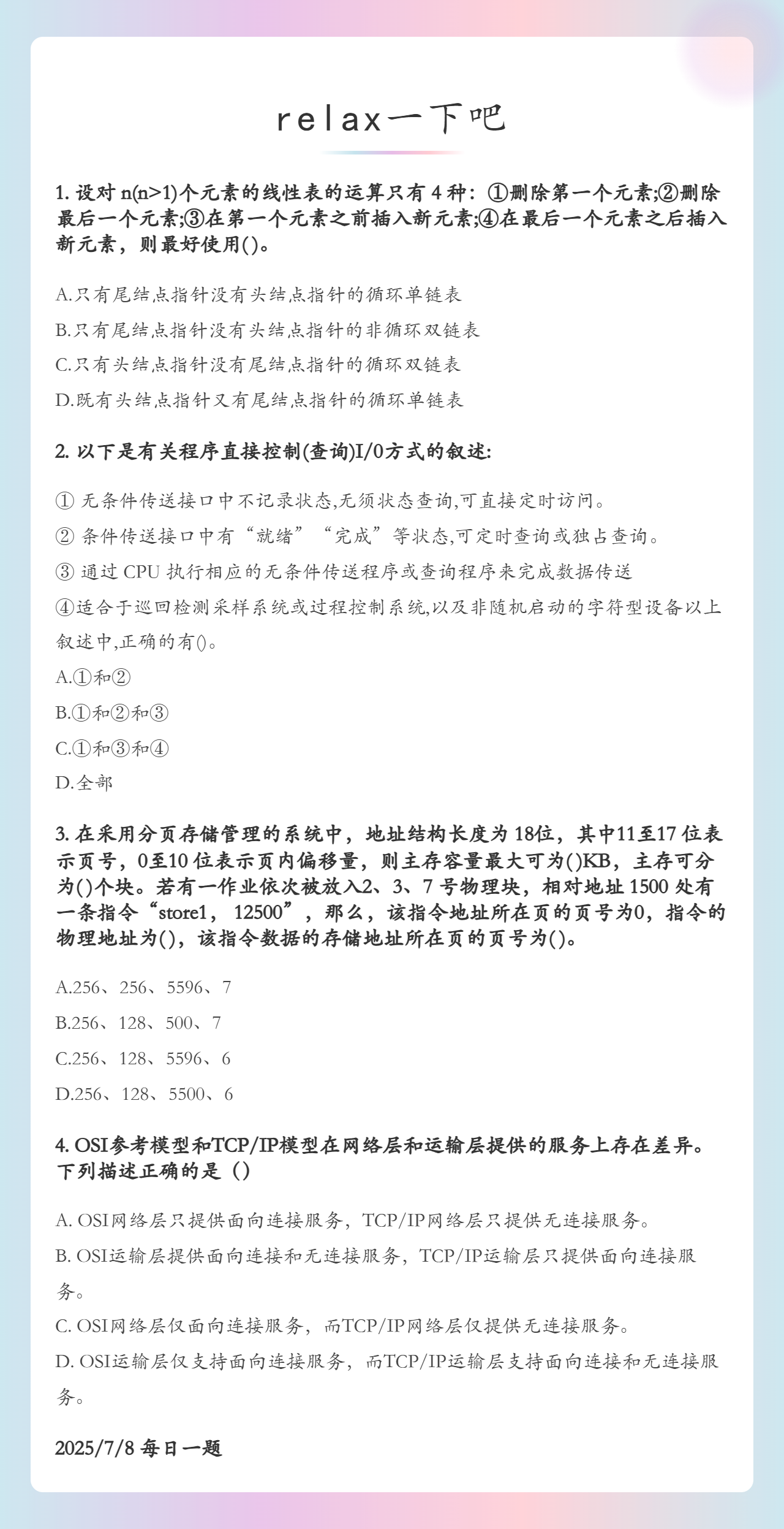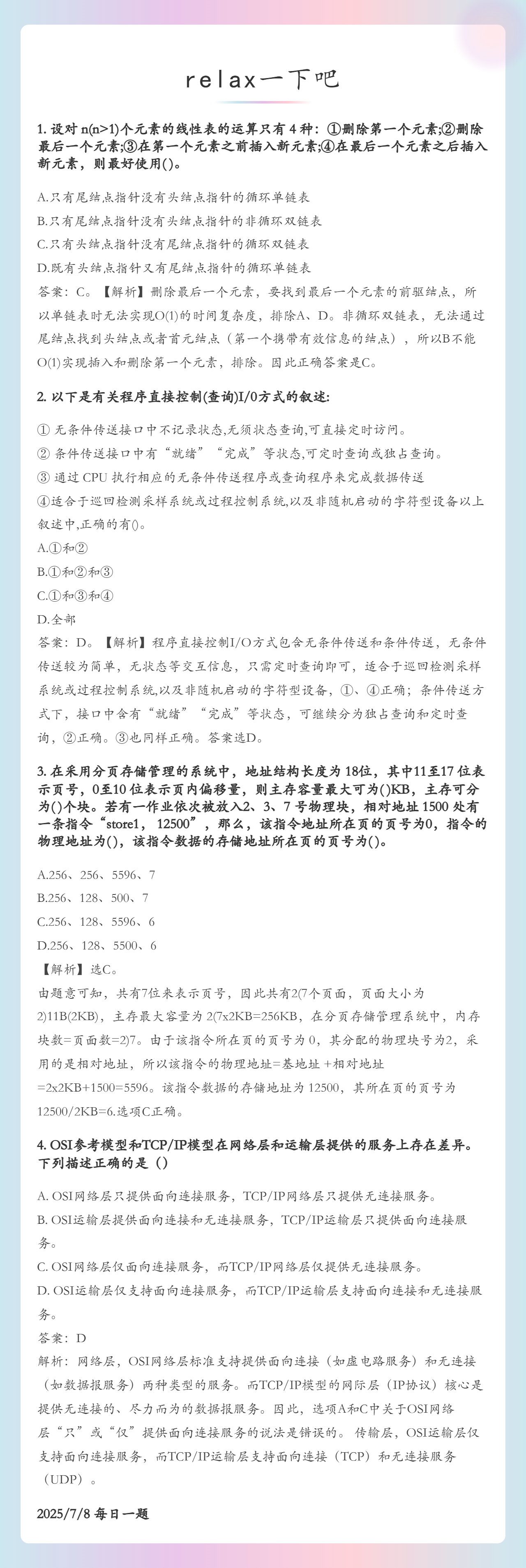 7.8 线性表和I/O查询方式和内存地址转换计算和OSI/TCP模型的区别